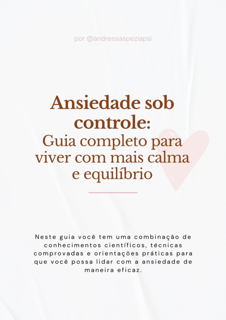 Você vive constantemente preocupada, ansiosa e sobrecarregada? Se sim, este e-book com conteúdo científico e prático foi criado para ajudá-la a entender e gerenciar sua ansiedade de maneira eficaz. Este ebook é mais do que um simples guia, é um companheiro para sua jornada de autodescoberta e crescimento. O objetivo também é te ajudar a lidar com as crises e principalmente prevenir que elas venham a acontecer.